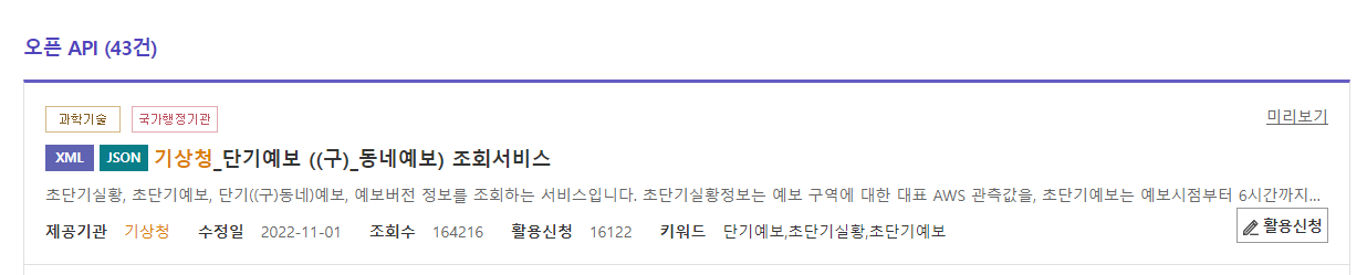 날씨정보 데이터는 공공데이터 포털 기상청 단기예보 조회서비스를 활용신청하였다.