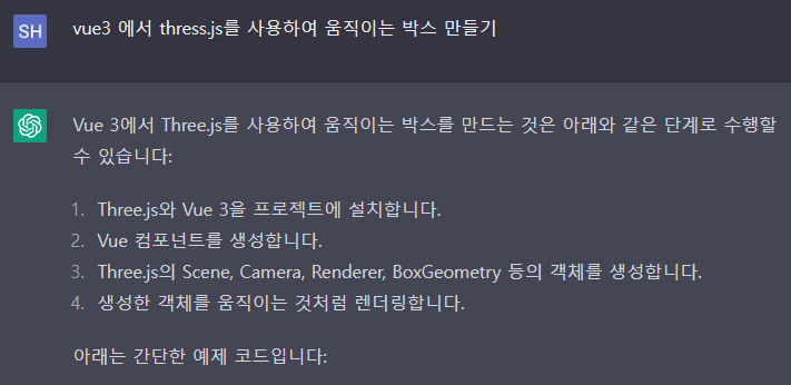 이번 테스트는 ChatGPT로 Three.js 라이브러리를 사용하여 움직이는 박스를 만드는 것이다.